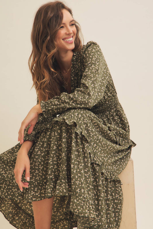 DITSY FLORAL RUFFLE SURPLICE MIDI DRESS WITH POCKETS