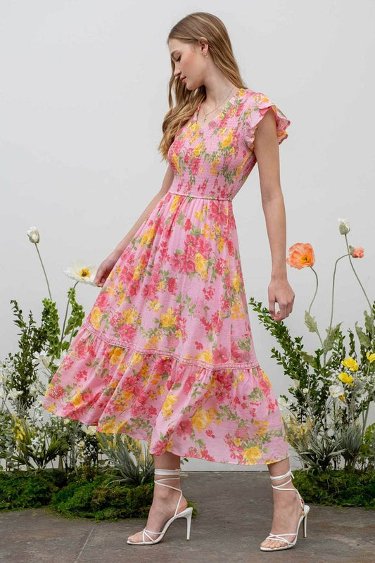 FLORAL SCOOP NECK SMOCKED MAXI DRESS