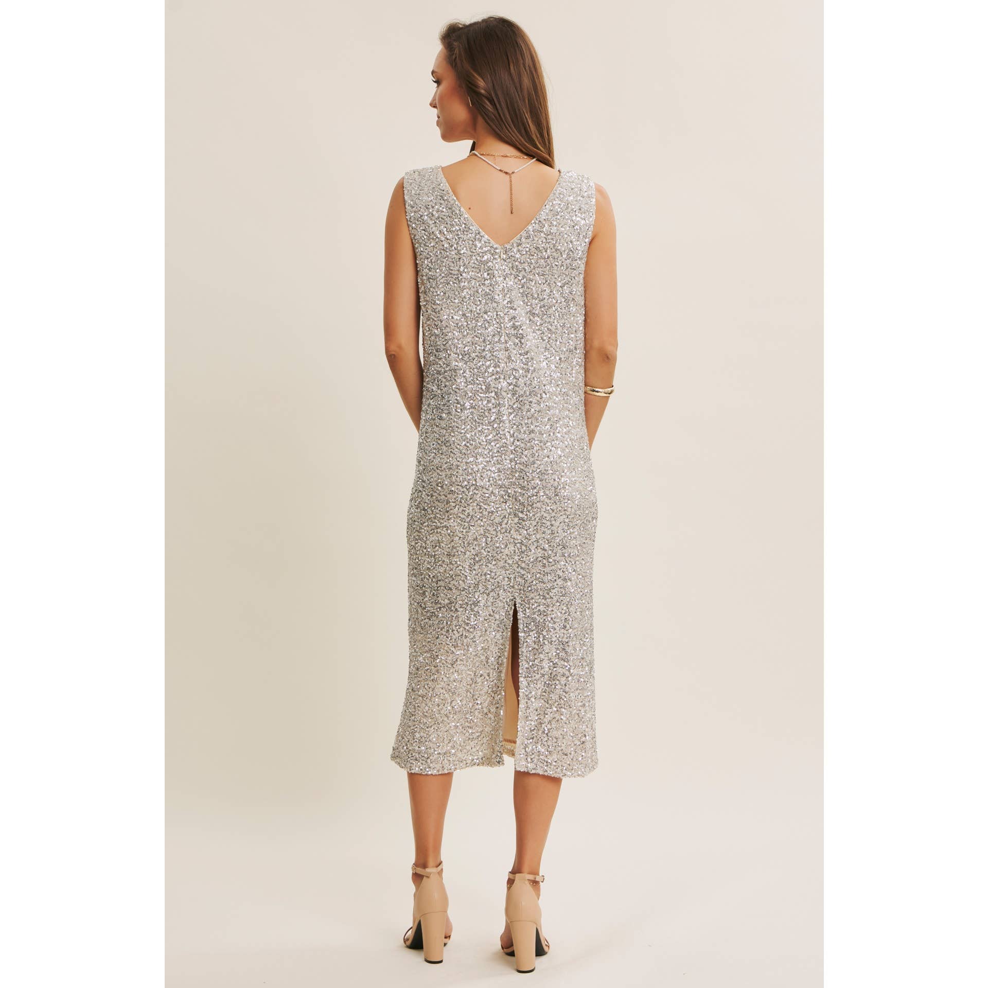 Radiate elegance in this champagne sequin midi dress, where every movement sparkles with sophistication. The luxurious sequin embellishment creates a mesmerizing shimmer that commands attention, while the delicate lace plunge insert introduces an alluring romantic element. Designed with a flattering sleeveless shift silhouette, the deep V-neckline and graceful back slit ensure both style and ease of movement. Whether you're celebrating the holidays, ringing in the New Year, or attending a wedding, this dress transforms any occasion into a glamorous affair. The fully lined interior guarantees comfort throughout the night. Elevate your look with strappy heels and bold jewelry for an unforgettable impression.