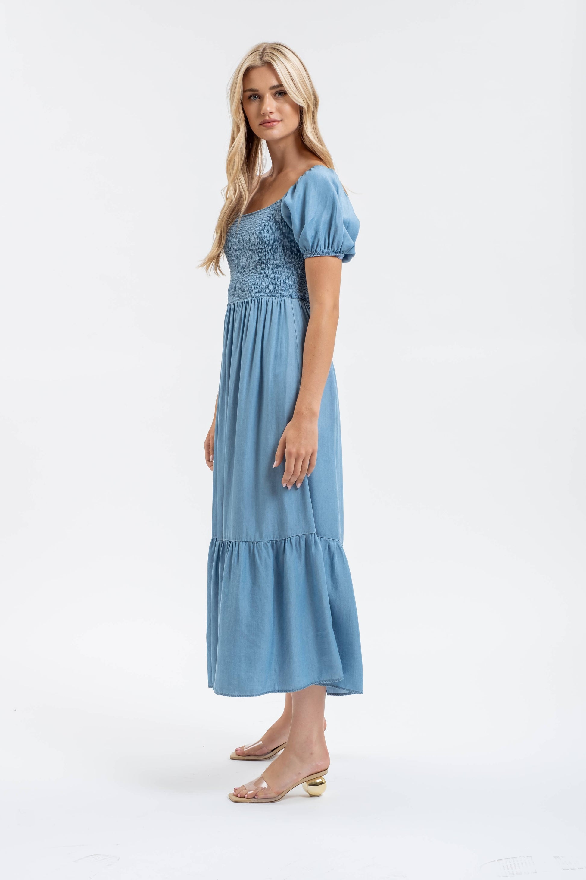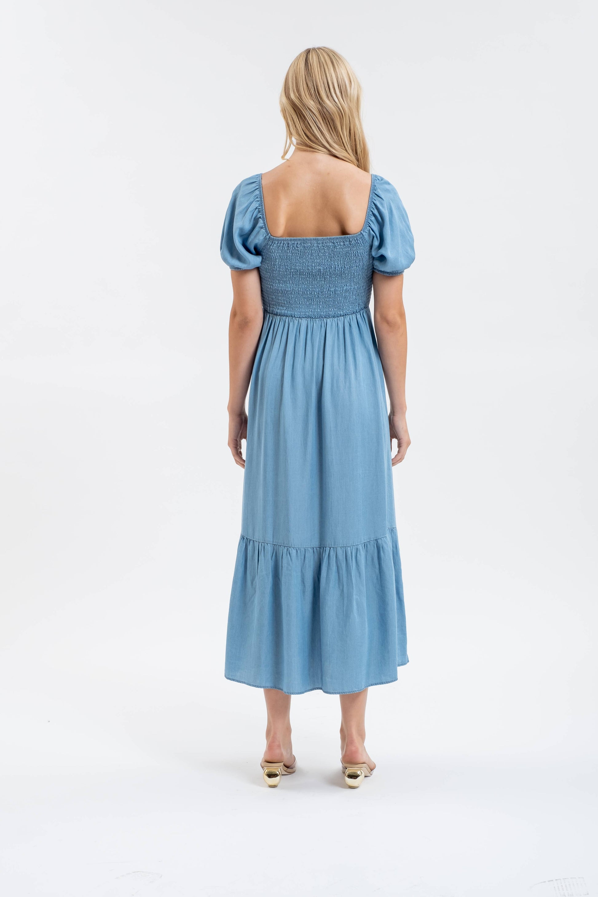 SMOCKED CHAMBRAY PUFF SLEEVE MIDI DRESS