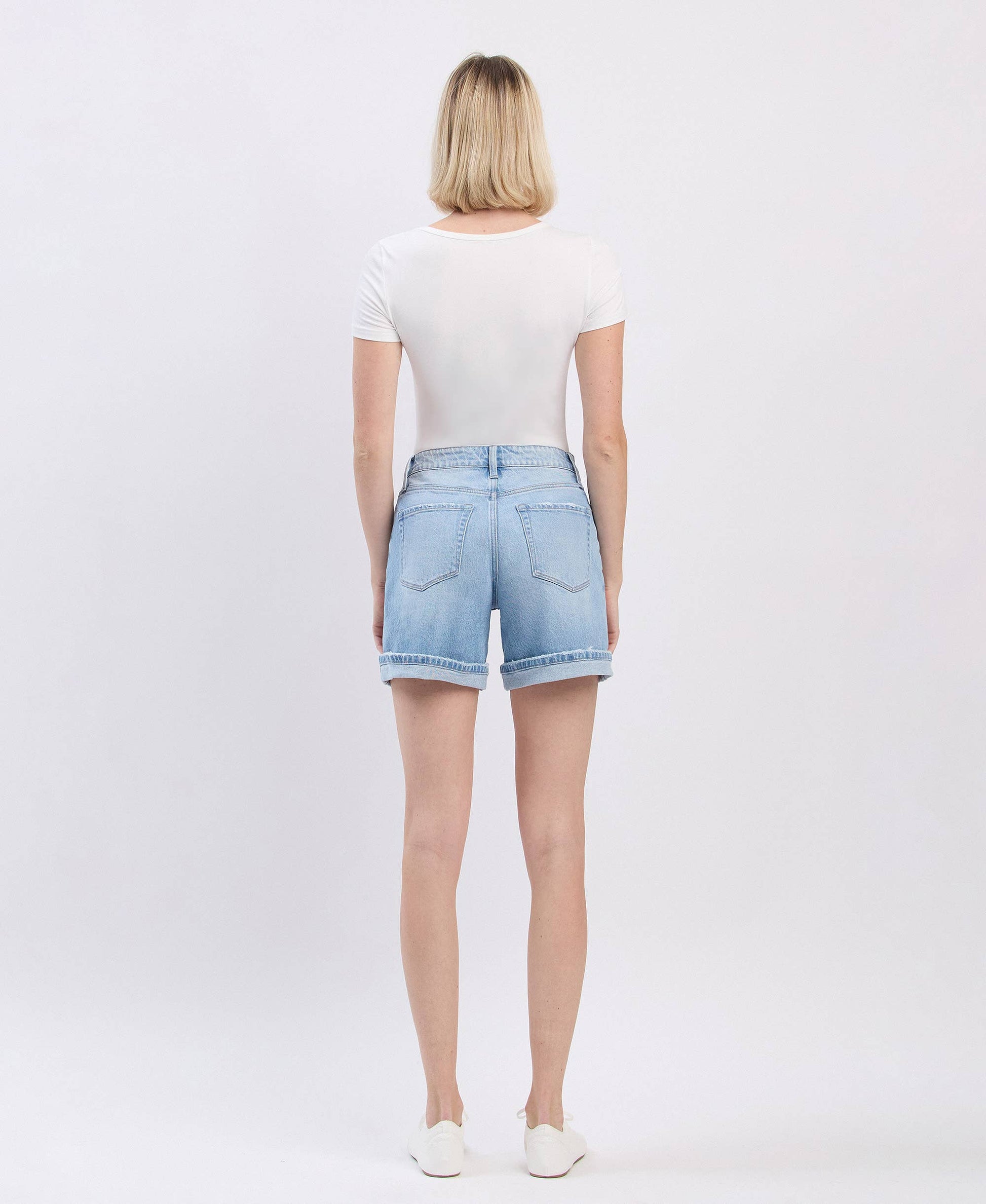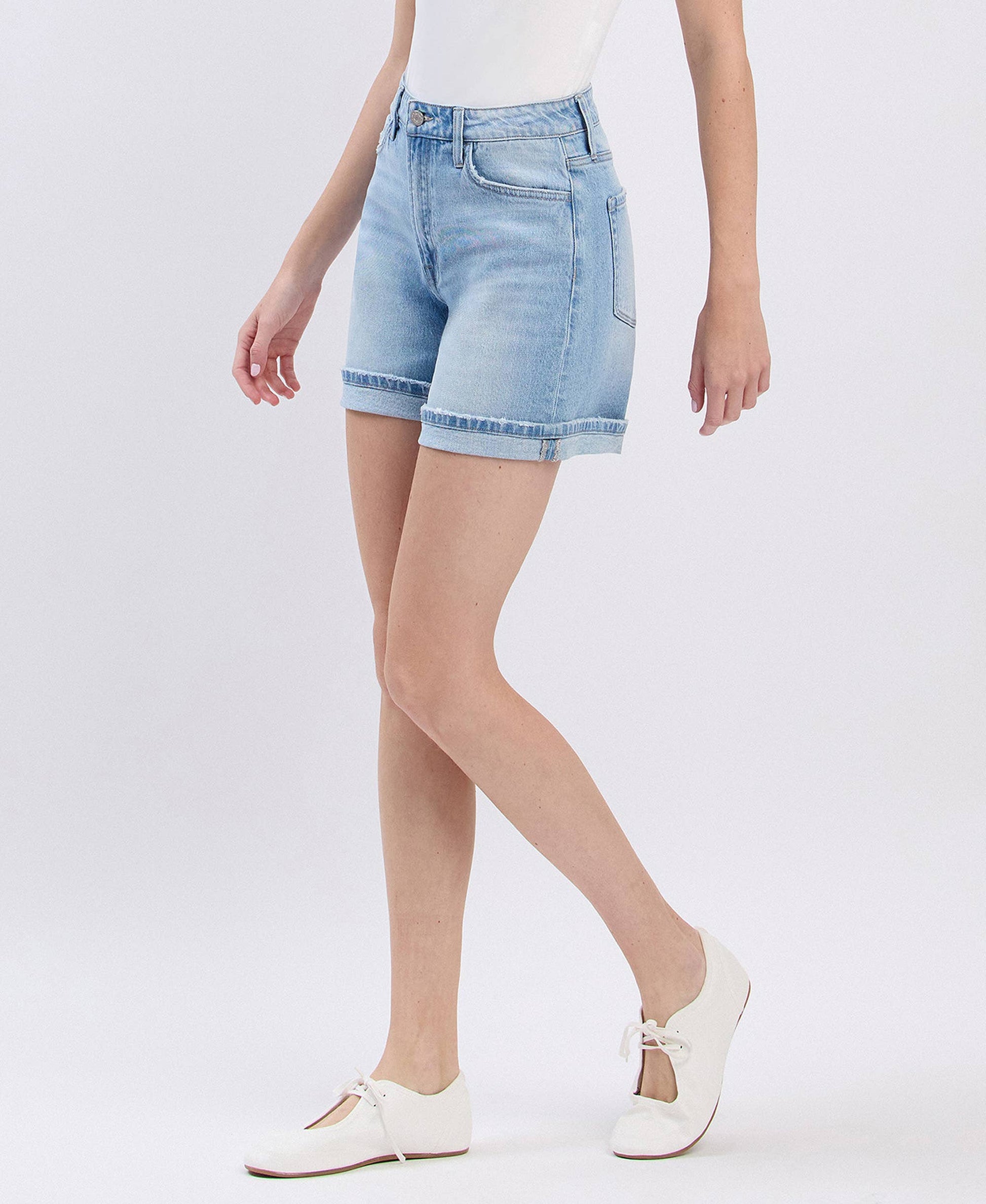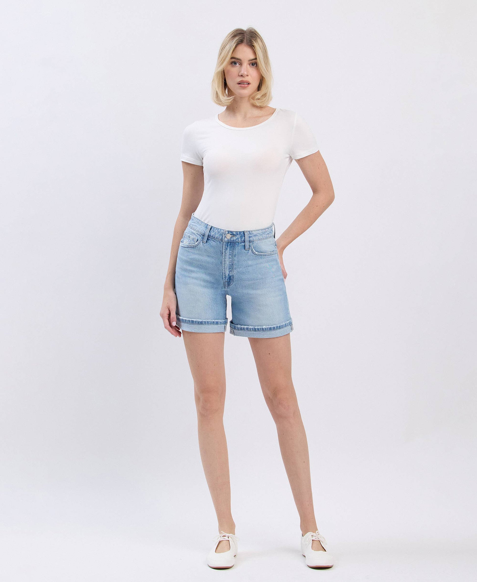 SUPER HIGH RISE MIDI DENIM SHORTS - Transform your everyday look with these figure-enhancing midi denim shorts, designed with a super high rise that beautifully defines your waistline. The flexible stretch denim provides all-day comfort, complemented by an elegant single cuff detail that elevates the finish. Perfectly proportioned with an 11" rise and 6" inseam, these shorts strike the ideal balance between modest coverage and contemporary style. The generous 24" leg opening creates a flattering silhouette that works wonderfully on diverse body shapes.