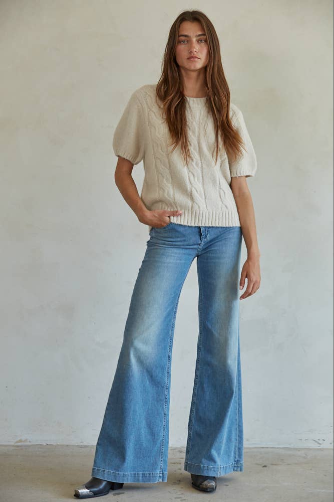 Crafted with a blend of premium materials, this cable knit pullover sweater boasts a short sleeve design and a crew neck silhouette. The impressive combination of acrylic, nylon, wool, and spandex ensures both comfort and style.